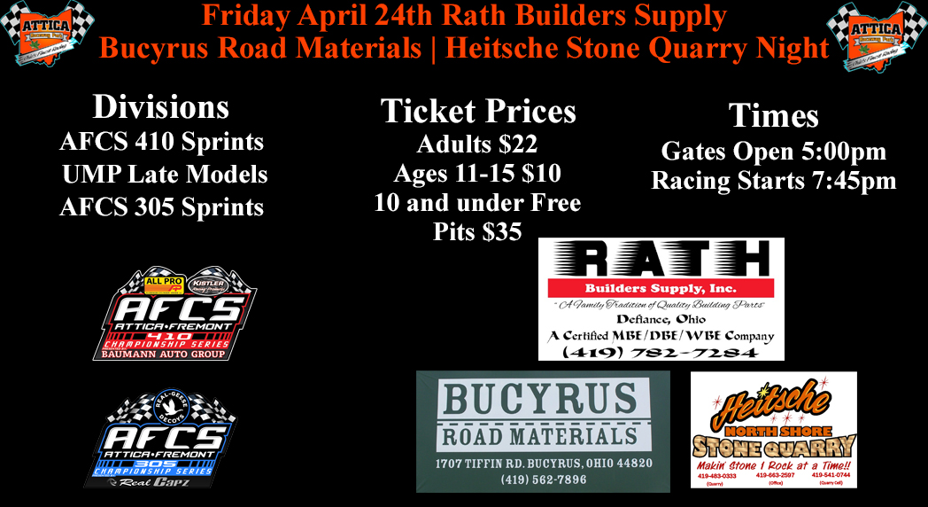 Attica Raceway Park will be back in action Friday, April 24 with the AFCS 410 and 305 sprints and UMP late models in action.